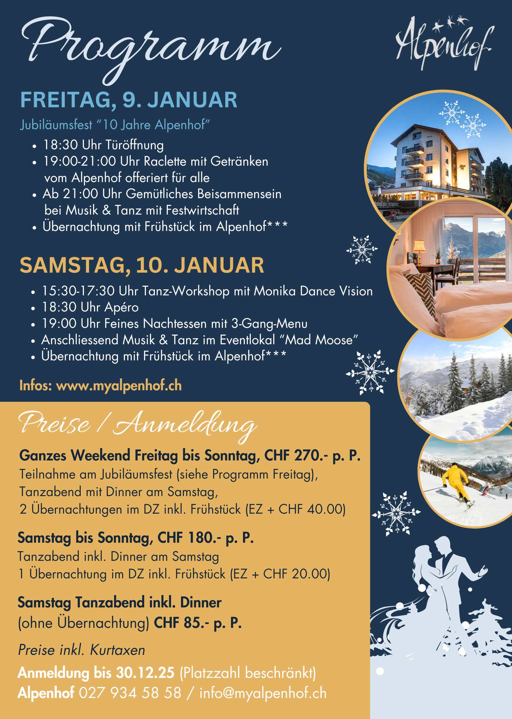 Home Kommende Events Vergangene Events Partner Über uns Kontakt Facebook FR-SO, 9.-11. Januar 2026: Tanzweekend im Alpenhof*** Infos & Künstler Zurück zur Übersicht "Vergangene Events"... Peter Schmid & Andrea Zur Website... Peter Cicak Veranstaltungsort & Anmeldung Hotel Alpenhof***Dorfstrasse 333944 Unterbäch (VS)027 934 58 58www.myalpenhof.ch nach oben scrollen